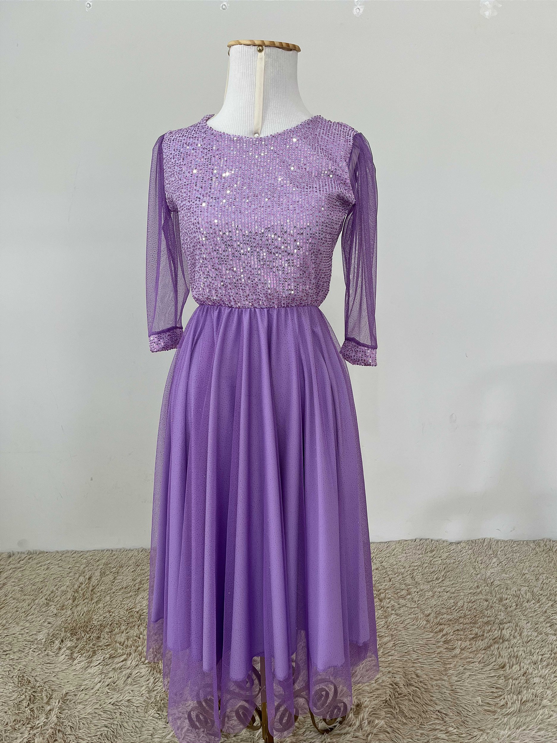 Vestido em paetê frente e costas, manga princesa 3/4 com punhos em paete, saia do vestido godê, com segunda camada de tule alongado