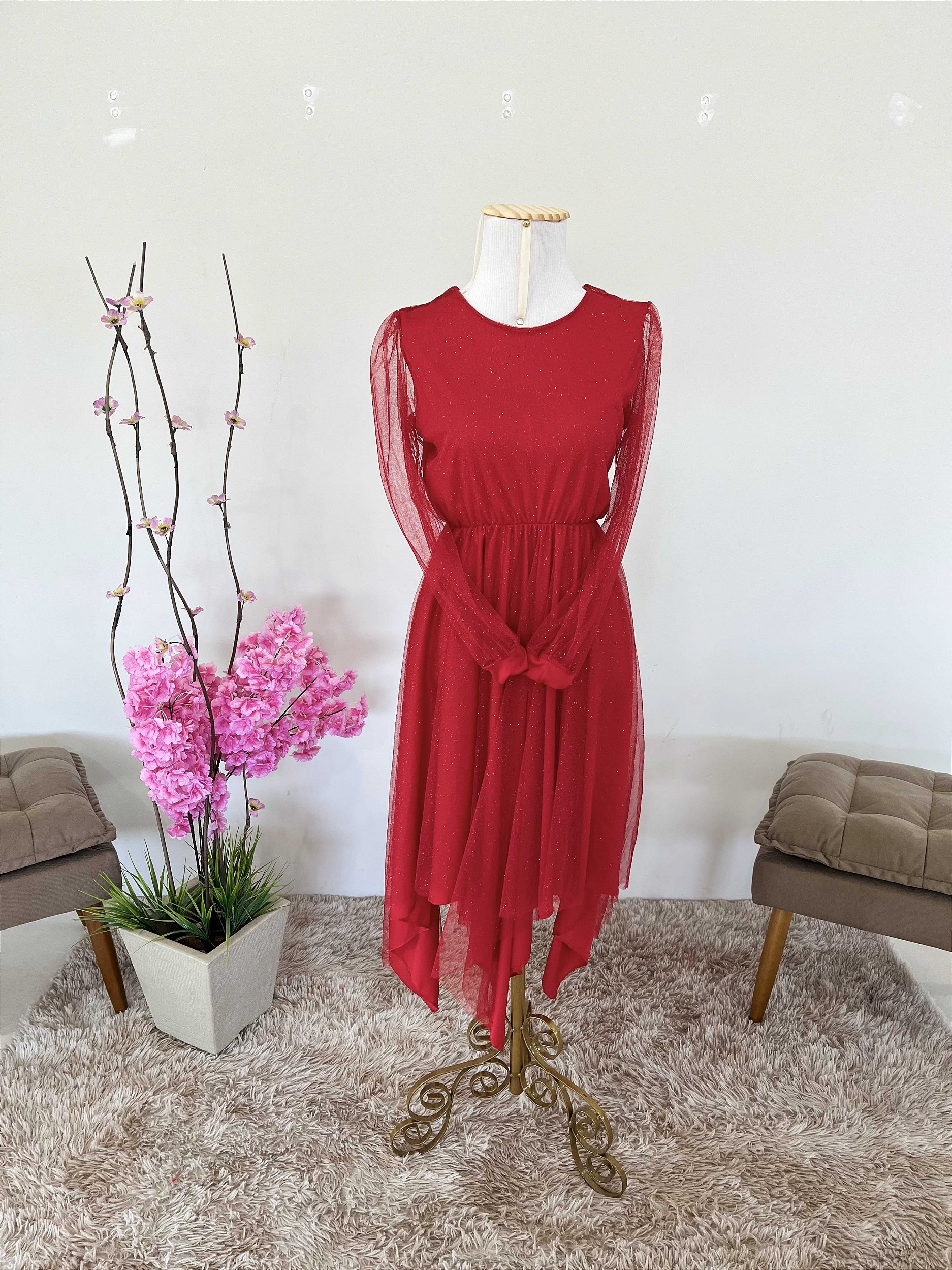 Vestido em helanca com tule com gliter, mangas bufantes e saia de pontas.